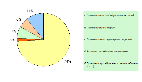 Основным потребителем муки являются хлебозаводы, причем за последние время произошло небольшое уменьшение их доли в пользу производства кондитерских изделий и бытового потребления населением.