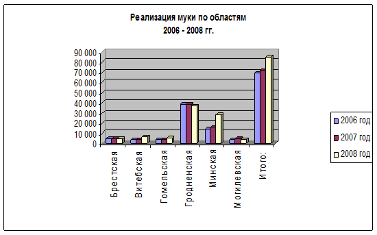Рисунок 4 – Реализация муки по областям 2006-2008 гг