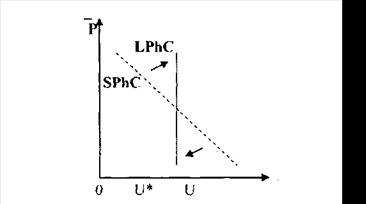 Для упрощения ситуации представим краткосрочную кривую Филлипса (SlJhC) в виде пунктирной прямой с отрицательным наклоном. На долгосрочном интервале кривая Филлипса принимает вертикальное положение (долгосрочная кривая Филлипса ДКФ / LPhC long-term Phillips curve). На графике она представляется как сплошная вертикальная прямая, указывая на уровень полной занятости (U*).