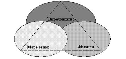 Досягнення мети виробництва з виготовлення продукції для задоволення потреб споживачів можливе тільки за умови тісної взаємодії виробничої функції насамперед з функціями маркетингу та фінансів, а також іншими допоміжними функціями. Такий взаємозв’язок трьох основних функцій відображений на рис. 1.2.