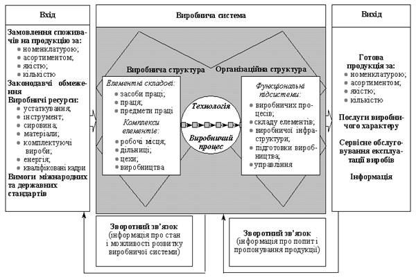 Виробництво — найважливіша сфера людської діяльності з перетворення предметів праці з метою задоволення потреб всіх суб’єктів суспільства. Таким чином, виробнича функція охоплює всі дії, що безпосередньо пов’язані з виготовленням товарів чи наданням послуг. Вона відіграє головну роль у створенні товарів або послуг і є ядром будь-якого промислового підприємства. Ресурсні вкладення здійснюються для отримання готових виробів за допомогою одного або кількох процесів перетворення (збереження, транспортування, оброблення). Щоб гарантувати бажаний (замовлений) продукт, на різних етапах процесу перетворення здійснюються заміри (зворотний зв’язок), а потім порівнюють результати з установленими стандартами і в разі необхідності коригують дії (контроль). На рис. 1.1 схематично показана виробнича функція як процес перетворення вкладених ресурсів у кінцеву продукцію.