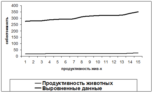 Таким образом, мы видим, что между продуктивностью и себестоимостью существует прямая связь, а также между ними существует тесная взаимосвязь. В среднем при увеличении продуктивности животных на 1ц/гол. себестоимость 1ц молока увеличивается на 10,62 руб.