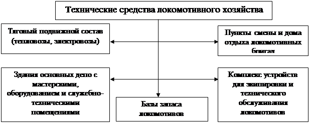 Технические средства локомотивного хозяйства размещаются на крупных железнодорожных станциях, узлах и в комплексе с железнодорожными путями и передаточными устройствами (линиями электроснабжения, водоснабжения) образуют основные локомотивные депо, пункты оборота и пункты технического обслуживания. К основным депо приписан тяговый подвижной состав.