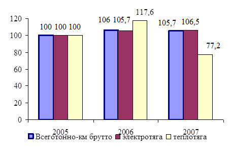 Из сложившихся в 2007 году общих тонно-километров брутто 97,9% приходится на перевозки с использованием электротяги и только 2,1% - с использованием тепловозной тяги. Причем, при рассмотрении динамики перевезенных тонно-км брутто пассажиров и грузов видно, что происходит рост перевозок грузов на электротяге (в 2007году больше на 7,8% по сравнению с 2005 годом), тогда как перевозка грузов на тепловозной тяге уменьшилась за три года 21,7%.