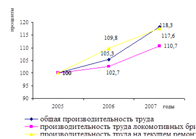 Увеличение количества ремонта локомотивов за три года составило 11,8%, что равняется значению равному 1192,3 условных локомотива, что на 126,3 условных отремонтированных локомотивов больше чем в 2005 году.