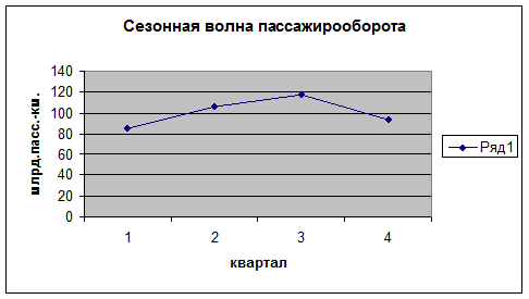 В таблице 1 приведены данные пассажирооборота России за 2000-2004гг. вычислим сезонную волну методом простой средней. Определим поквартальные средние уровни пассажирооборота как простые средние арифметические за каждый квартал на протяжении всего изучаемого периода.