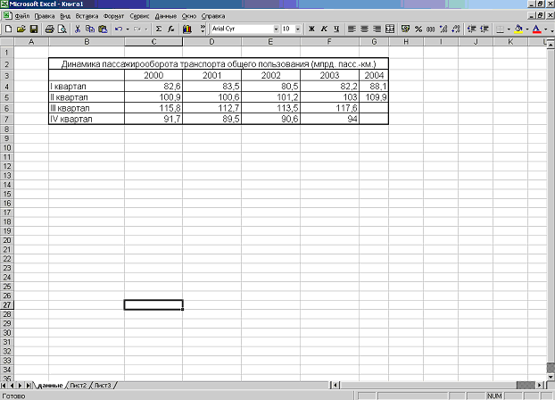 Далее определим средний квартальный объем пассажирооборота за весь период в целом , как отношение общей суммы пассажирооборота к числу периодов: