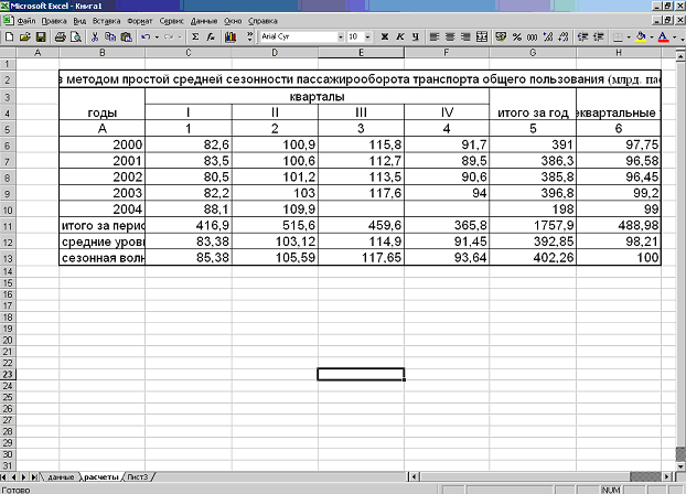 | Анализ методом простой средней сезонности пассажирооборота транспорта общего пользования (млрд. пасс.-км.) |