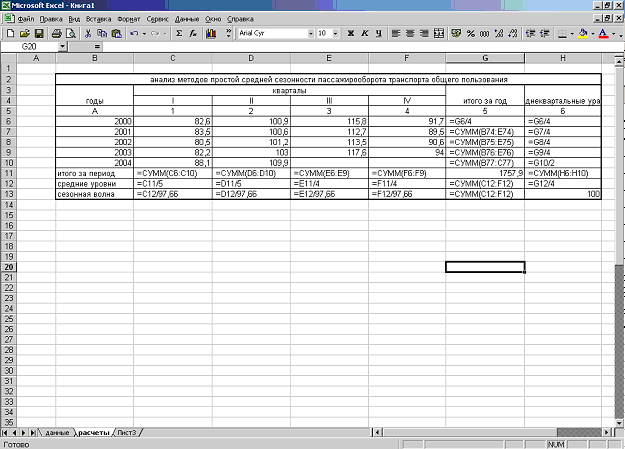 Сущность этого метода изучения и измерения сезонных колебаний заключается в определении индекса сезонности (сезонной волны) с помощью средней арифметической. Индексами сезонности являются процентные отношения фактических (эмпирических) внутригрупповых уровней к теоретическим (расчетным) уровням, выступающим в качестве базы сравнения. (Гусаров В.М. «Теория статистики», ЮНИТИ 1998, стр.152 ).