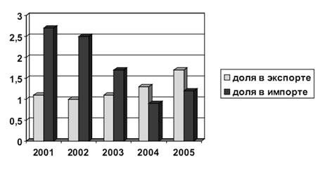 Рисунок 2 - Доля внешней торговли компьютерными и информационными услугами в структуре торговли "прочими услугами" России в 2001–2005 гг. (в % к итогу)