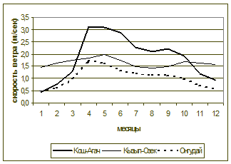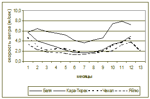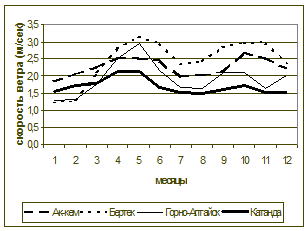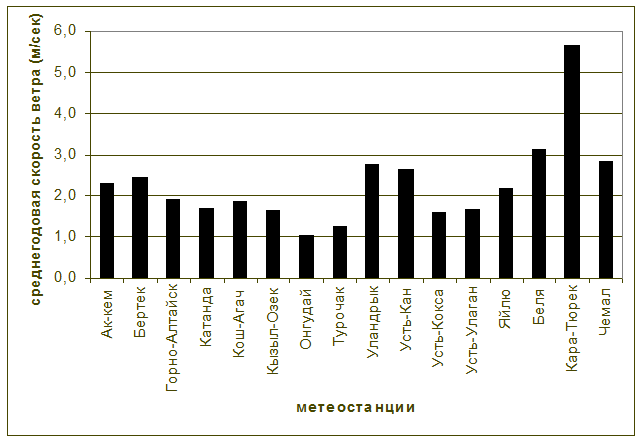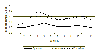При этом годовые амплитуды изменения данного показателя для одних станций незначительны (до 0,5 м/сек), но для других это значение колеблется до 2,5 м/сек (Бертек, Горно-Алтайск, Кош-Агач).