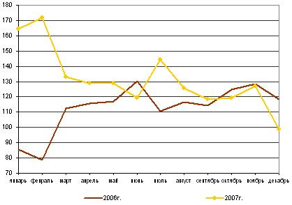 Индексы физического объема ввода в действие общей площади жилых домов за периоды 2006–2007 гг. изображены на рисунке 1.