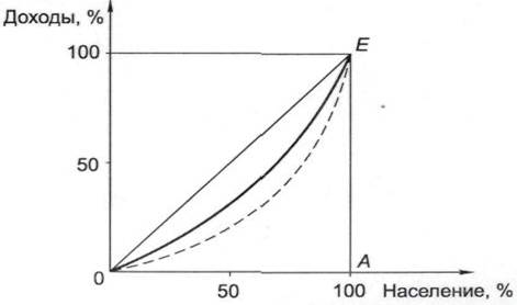 Чем больше кривая Лоренца отклоняется от линии абсолютного равенства, тем неравномернее распределяются доходы в обществе. Так, штрих-пунктирная кривая характеризует большую неравномерность распределения дохода, чем сплошная кривая распределения. Отношение площади сегмента между биссектрисой ОЕ и кривой Лоренца к площади треугольника ОАЕ называется коэффициентом Джинни, который назван по имени итальянского экономиста и статистика К. Джинни. Если коэффициент равен 0, кривая Лоренца совпадает с прямой ОЕ и доходы в обществе распределяются абсолютно равномерно. При значении коэффициента 1 кривая Лоренца будет представлена катетами треугольника ОАЕ, что свидетельствует об абсолютном неравенстве в распределении доходов. Практически коэффициент Джинни никогда не достигает ни нуля, ни единицы, однако считается, что его значение, большее 0,4 (40), отражает высокую степень расслоения общества.