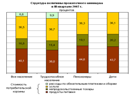 По сравнению со II кварталом 2007 г. величина прожиточного минимума возросла в среднем на 1,8%. При этом прирост стоимости продуктов питания потребительской корзины составил 3,2%, непродовольственных товаров - 1,5%, услуг - 0,5%.