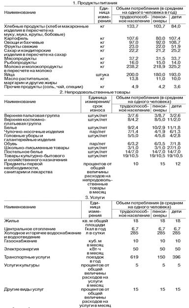 [1] Потребительская корзина определяется для основных социально-демографических групп населения в целом по России и субъектам Федерации не реже одного раза в пять лет на основе методических рекомендаций, разрабатываемых Правительством России с участием профсоюзов. Потребительская корзина в целом по стране устанавливается федеральным законом, а в субъектах Федерации – их законодательными органами. При этом региональные разработчики потребительской корзины ориентируются на учет природно-климатических условий, национальных традиций и местных особенностей потребления продуктов питания, непродовольственных товаров и услуг.