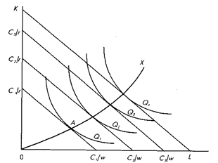 При неизменных ценах на факторы производства увеличение общей суммы издержек графически выразится в параллельных сдвигах вверх и вправо линий изокост. Каждая из этих изокост будет касательной только к одной изокванте. Точки касания изоквант и изокост показывают максимальный выпуск продукции при данном уровне затрат или минимальные издержки, необходимые для данного выпуска продукции. Линия, соединяющая все точки касания изокост и изоквант, показывает, как количество используемых факторов производства будет изменяться с изменением уровня выпуска фирмы. Эта кривая называется «путь развития фирмы» и представлена линией 0Х на рис. 2.2. Таким образом, путь развития фирмы показывает, как меняется спрос на труд в долгосрочном периоде при изменении объема выпуска продукта.
