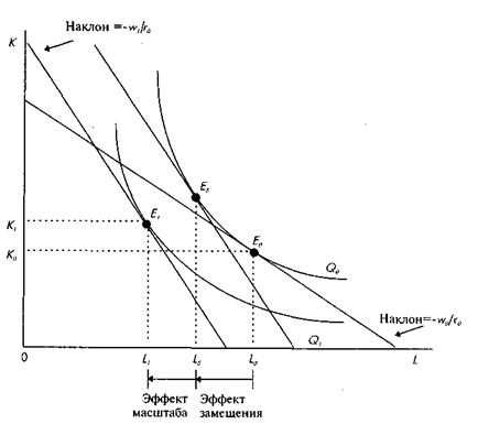 Помимо этого повышение заработной платы вызовет повышение издержек и сокращение выпуска продукта до Q1 . В итоге объем используемых факторов будет определяться точкой E1 , точкой касания изокванты Q1 и изокосты с наклоном – w1 /r0 . Эффект масштаба в этом случае выразится в сокращении спроса на труд с LS до L1 . Совокупное действие эффекта масштаба и эффекта замещения выразится в сокращении спроса с L0 до L1 .