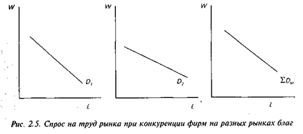 В случае, если фирмы конкурируют на одном рынке труда и на разных рынках благ, общий спрос на труд равен сумме спроса на труд отдельных фирм, DM = SDj На рис 2.5 это показано суммированием по горизонтали кривых спроса D1 и D2 отдельных фирм.