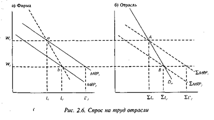 В случае, если фирмы конкурируют на одном рынке труда и на одном рынке благ, т.е. образуют отрасль, то спрос такой отрасли на труд не равен сумме спроса на труд ее отдельных фирм. Фирма так мала по отношению к рынку, что изменения в ее выпуске не оказывают влияние на цену продукта, но в масштабах отрасли увеличение выпуска продукции приведет к снижению ее цены. Тогда (рис. 2.6) при снижении заработной платы от W1 к W2 каждая отдельная фирма увеличит объем используемого труда от L1 до L’2 и увеличит выпуск продукции, для отрасли в целом это приведет к увеличению общего выпуска и снижению цены на продукт, соответственно кривая предельного денежного продукта фирмы сдвинется влево от MRP1 к MRP2 , и спрос отдельной фирмы на труд составит L2 , а спрос отрасли на труд DM будет равен SL2 . Кривая спроса на труд отрасли будет расположена круче, чем кривая спроса на труд фирмы. Разница в наклоне кривых будет зависеть от эластичности спроса по цене на продукт отрасли h.