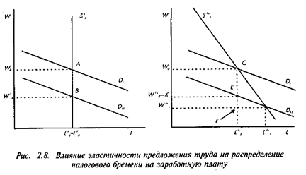 На рис. 2.8б изображена ситуация, когда равновесие на рынке труда достигается на отрезке обратного изгиба кривой предложения труда с отрицательной эластичностью S’1 L . В этом случае введение налога и сдвиг кривой спроса на труд до DL 1 приведут не к снижению, а к увеличению занятости с L1 ’0 до L1 ’1 при снижении заработной платы до W1 ’1 . Величина, на которую уменьшится заработная плата, будет большей, чем величина налога, отрезок CF больше отрезка СЕ.