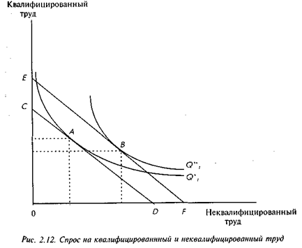 Предположим, что в долгосрочном периоде цены на капитал возрастут. Тогда фирма будет применять меньше капитала, а для сохранения производства на уровне Q1 увеличит применение труда. При более высоких издержках на капитал изокванта Q’1 сдвигается вправо вверх (Q’’1 ). При неизменных ценах на квалифицированный и неквалифицированный труд фирма минимизирует издержки, производя Q1 в точке В. При этом наклон изокванты скорее всего изменится, как это показано на рис. 2.12, так как если цена капитала возрастает, фирма сократит спрос на квалифицированный труд и капитал и компенсирует это сокращение увеличением применения неквалифицированного труда. Капитал и квалифицированный труд выступают, как правило, дополнителями в производстве, они используются вместе, и когда меняется цена одного из этих факторов, фирма меняет спрос на оба в одном и том же направлении.