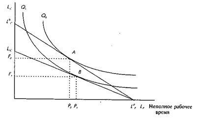 На рис. 2.13 линия издержек на труд, изокоста (L0 C L0 p ), показывает количество часов работы, обеспечиваемое при данном уровне расходов различными комбинациями неполной и полной занятости. Если труд на условиях неполного времени относительно дешевле, то кривая будет иметь более пологий наклон. Выбор конкретной комбинации работников, занятых полное и неполное время, зависит от относительных издержек на их труд и от их относительной производительности. Первоначальная относительная производительность работников, занятых полное и неполное время, отражена изоквантой Q0 . Производительность работников, занятых полное и неполное время, может различаться по целому ряду причин. Во-первых, производительность занятых полное рабочее время может быть ниже из-за усталости, во-вторых, из-за того, что на некоторых работах требуется кратковременная концентрация внимания и энергии, в-третьих, когда спрос на продукт труда неустойчив, как это бывает в сфере индивидуальных услуг. С другой стороны, занятые неполное рабочее время менее производительны на тех работах, где требуется длительное наблюдение за производственным процессом для принятия решений по работе.