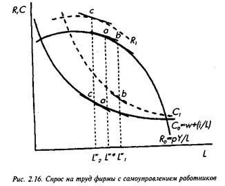 Изменение ставки процента отразится на издержках. Объем выпуска и занятости меняются в одном направлении с i (т.е. если i возрастает, то же происходит и с Yи L). На рис. 2.16 это показано сдвигом с равновесного уровня LW *, где вертикальное расстояние аа между кривыми дохода на одного работника R0 и средних издержек на одного работника C0 максимально, к новому равновесию LW 1 и максимальному вертикальному расстоянию bb между R0 и C1 . В условии максмизации доходов работников более высокому i соответствует увеличение L, сокращающее dY/dL быстрее, чем Y/L и увеличивающее разрыв (Y/L– dY/dL).