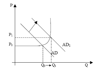 Монетаристы видят в денежном предложении единственный фактор, определяющий уровень производства, занятости и цен. Теоретические рассуждения монетаристов проистекают из того, что расширение денежного предложения повышает спрос на все виды активов, а также на текущий объем производства. Следовательно, в условиях полной занятости цены на все факторы возрастут. Кроме того, Монетаристы считают скорость обращения денег стабильной – в том смысле, что ее колебания невелики и она не изменяется в ответ на изменение самого по себе денежного предложения. Значит, изменения денежного предложения оказывает предсказуемое воздействие на уровень номинального ЧНП (=PQ). Монетаристы полагают, что, хотя изменение М может вызвать краткосрочные изменения в реальном объеме производства и занятости, поскольку рынок приспосабливается к этому изменению, в длительной перспективе изменение М воздействует на уровень цен. Монетаризм исходит из того, что передаточный механизм проще и гораздо яснее, чем предполагает кейнсианская модель. С точки зрения монетаристов, изменение совокупного спроса влияет на номинальный ЧНП в длительной перспективе преимущественно через изменение уровня цен. Монетаристы значительно умаляют фискальную политику как средство перераспределения ресурсов и стабилизации. Они полагают, что абсолютная беспомощность и безрезультатность фискальной политики обусловлена эффектом вытеснения. Предположим государство создает бюджетный дефицит, продавая облигации, то есть занимая деньги у населения. Но занимая деньги, государство вступает в конкурентную борьбу с частным бизнесом за фонды. Государственные займы расширяют спрос на деньги, поднимаются процентную ставку и вытесняют значительное количество частных капиталовложений, которые в противном случае были бы прибыльными. Конечный результат воздействия бюджетного дефицита на совокупные расходы непредсказуем или несуществен.[15].Большинство монетаристов не советуют использовать политику дешевых и дорогих денег для смягчения подъемов и спадов экономического цикла. С точки зрения монетаристов, экономическая нестабильность порождается скорее неправильным кредитно-денежным регулированием, чем внутренней неустойчивостью экономики. Поэтому монетаристы предлагают монетарное правило, согласно которому денежное предложение увеличивается в соответствии с долгосрочным ростом реального ЧНП. С точки зрения монетаристов, совокупный спрос смещается вправо или влево главным образом в результате соответственного расширения или сокращения денежного предложения. Монетаристы считают кривую совокупного предложения крутой, или, если взять крайний случай, вертикальной. Почти вертикальная линия отражает классическую основу монетаризма. С точки зрения монетаристов, изменение совокупного спроса влияет преимущественно на уровень цен и оказывает слабое воздействие на реальный ВНП. Данный вывод следует из предположения, что если Центральный банк придерживается монетарного правила, то объем производства в экономике все время находится на уровне почти полной занятости. Если те, кто делают политику, попытаются использовать стабилизационные меры, их усилия окажутся напрасными. В результате смещения кривой совокупного спроса с AD1 к AD2 мы получаем скромный рост реального объе