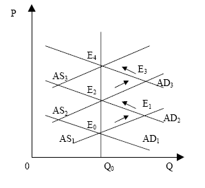 Сочетание инфляции спроса, инфляции издержек и инфляционных ожиданий порождает инфляционную спираль. Раскручивание инфляционной спирали показано на рис. №3. Допустим, что экономика находится в равновесии в точке Е0 в условиях полной занятости. Стимулирование экономики со стороны государства (при помощи кредитно-денежных или бюджетных методов) вызовет смещение кривой совокупного спроса вправо в положение AD2 и установление равновесия в точке Е1. Повышение уровня цен вызывает инфляционные ожидания, в соответствие с которыми хозяйствующие субъекты строят свое экономическое поведение. Увеличение ставок заработной платы по требованию наемных работников вызывает увеличение средних издержек. Кривая AS сдвинется вверх, а новое равновесие установится в точке Е2. Этот процесс может продолжаться далее, все увеличивая инфляцию.