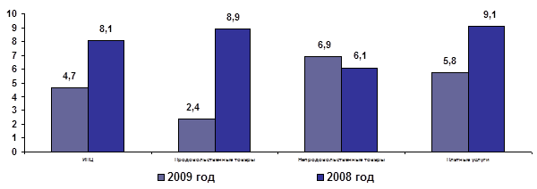 В структуре ИПЦ лидером прироста цен в сентябре 2009 года к декабрю 2008 года стали непродовольственные товары, которые подорожали на 6,9% (по сравнению с 6,1% за аналогичный период прошлого года). Платные услуги составили 5,8% (9,1%). Рост цен на продовольственные товары составил 2,4%, что на 6,5 процентных пункта ниже, чем за аналогичный период прошлого года (8,9%).
