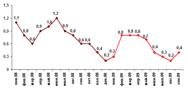 Индекс потребительских цен в сентябре 2009 года по сравнению с предыдущим месяцем составил 100,4%.
