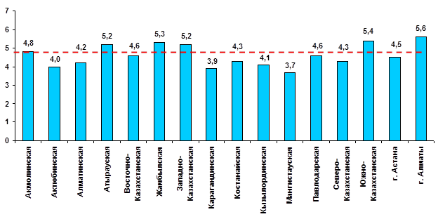 В региональном разрезе в сентябре 2009 года к декабрю 2008 года наибольший уровень инфляции, превышающий среднереспубликанский сложился в Южно-Казахстанской (5,4%), Жамбылской (5,3%), Атырауской и Западно-Казахстанской (по 5,2%), Акмолинской (4,8%), областях и в городе Алматы (5,6%).