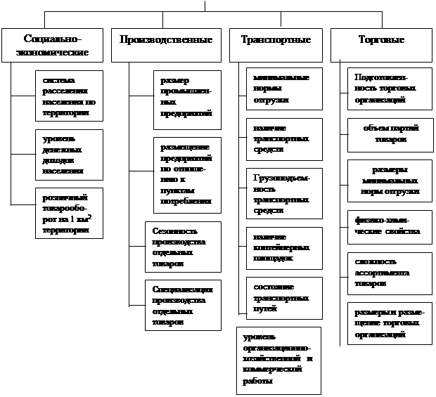 К транспортным факторам относятся: минимальные нормы отгрузки, состояние транспортных путей, связывающих места производства и пункты потребления, наличие транспортных средств, их грузоподъемность, наличие контейнерных площадок. Здесь большое значение имеет правильный выбор видов транспорта, определение потребности подвижного состава, эффективное его использование, возможность широкого применения прогрессивных технологий при перевозках товаров.