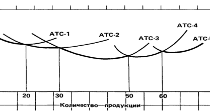 На рисунке 1 эта закономерность проиллюстрирована применительно к пяти различным размерам предприятия. Кривая АТС-1 показывает динамику средних общих издержек для самого маленького из пяти предприятий, кривая АТС-5 — для самого большого. Соотношение между этими пятью кривыми в точности соответствует изложенному выше правилу. Строительство все более крупных предприятий будет приводить к снижению минимальных издержек на производство единицы продукции вплоть до достижения размеров третьего предприятия. Однако за этим пределом расширение производственных мощностей будет означать повышение минимального уровня средних общих издержек.