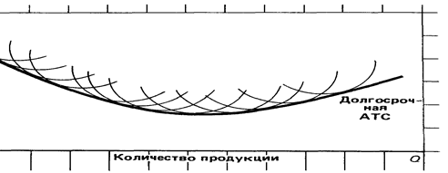 Наблюдая за этими приспособительными изменениями, можно заключить, что кривая долгосрочных АТС для отдельной фирмы состоит из участков кривых краткосрочных АТС применительно к различным размерам тех предприятий, которые могут быть построены. Кривая долгосрочных средних общих издержек (АТС) показывает наименьшие издержки производства единицы продукции, с которыми может быть обеспечен любой объем производства при условии, что фирма имела в своем распоряжении достаточно времени для проведения всех необходимых изменений в размерах предприятия. На рисунке 2 жирной ("ухабистой") линией показана кривая долгосрочных АТС фирмы или, как ее часто называют, кривая выбора (или плановая кривая) фирмы.