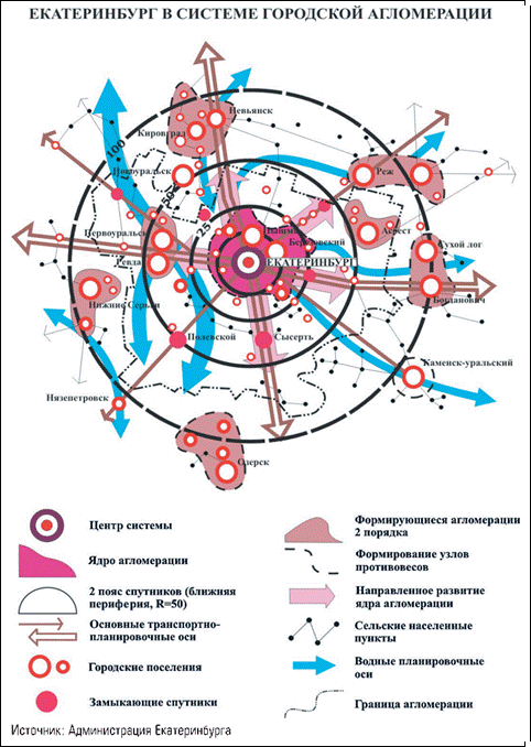 В Генеральном плане Екатеринбурга, в разделе “Схема положения г. Екатеринбурга в системе расселения”, подготовленном мастерской генплана проектного института ОАО “Уралгражданпроект” (рук. В. А. Путилов), впервые было детально рассмотрено развитие населенных мест Екатеринбургской агломерации в комплексе. До этого проекта все предложения по развитию агломерации носили лишь локальный характер. В проекте были рассмотрены три основных варианта возможного развития Екатеринбургской городской агломерации. Это планировочные и расселенческие альтернативы развития, направленные на решение проблемы взаимосвязанной территориальной организации производства и расселения.
