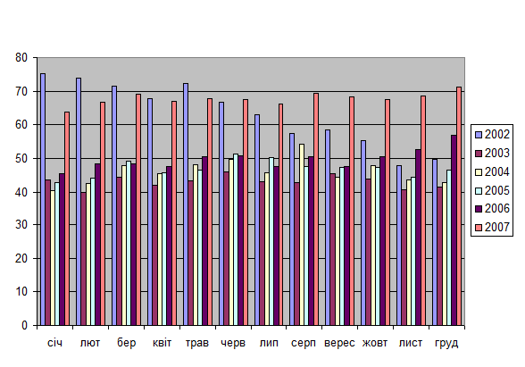 За даними діаграми можна сказати, що виробництво м’яса є майже стабільним на протязі року. Лише в період загострення економічної кризи в аграрній промисловості його виробництво зменшилось.