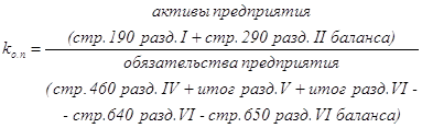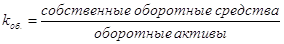 Он определяется как отношение разности между объемами источников собственных средств (реальный собственный капитал) и фактической стоимостью основных средств и прочих внеоборотных активов (итог I раздела актива баланса) к фактической стоимости находящихся в наличии у предприятия оборотных средств в виде производственных запасов, незавершенного производства, готовой продукции, денежных средств, дебиторских задолженностей и прочих оборотных активов (итог II раздела актива баланса).