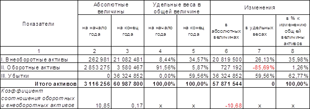 Анализируя структуру активов предприятия, следует отметить резкое и значительное изменение коэффициента соотношения оборотных и внеоборотных активов с 10,85 на начало года до 0,17 на конец года. Это явилось следствием значительного роста величины внеоборотных активов с 262'981 руб. до 21'082'481 руб., доля этого вида активов в общей сумме имущества на конец отчетного периода составила 34,57% (см. табл. 2.1). Само по себе изменение данного коэффициента еще не говорит об ухудшении финансового состояния, однако рассматривая этот показатель в системе общих результатов финансово-хозяйственной деятельности предприятия, четко видна негативная сторона данного изменения.