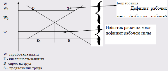 Из данной модели видно, что в точке пересечения D и S устанавливается равновесная цена за труд (заработная плата, W0 ) и определенный уровень занятости (Е0 ). В том случае, если уровень заработной платы по каким-то причинам повысится (с W0 до W1 ), то и величина предложения вырастет, так как на рынке появится дополнительное число лиц, ранее не соглашавшихся работать за зарплату W0 . Однако, спрос на труд сократится в связи с тем, что для определенной части работодателей будет невыгодно нанимать рабочую силу из-за ее дороговизны. Результатом повышения заработной платы "сверх" равновесной цены станет увольнение части персонала, что приведет к росту безработицы, так как предложение рабочей силы превысит спрос на нее.