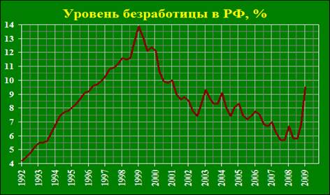 1 июля 1991 года началась официальная регистрация безработных в городах России. Российская система службы занятости, созданная в соответствии с принятым в 1991 году законом РФ «О занятости населения в Российской Федерации» стала посредником в поиске работы гражданами и работников работодателями. В 1995 году число безработных увеличилось почти вдвое по сравнению с 1992 (по результатам обследования населения по проблемам занятости число безработных в стране составило 6,6 млн. человек). В 1998 году число безработных превысило 7 миллионов человек, что не могло не сказаться на уровне экономической активности населения. С 1999 года уровень безработицы стал снижаться (Приложение 1)[6] .