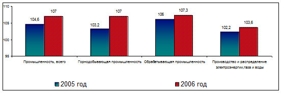 Диаграмма 3. Индексы физического объема промышленной продукции в 2005 - 2006 гг. (в % к соответствующему периоду прошлого года)[5]