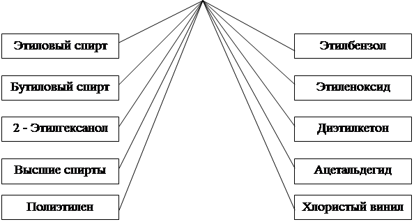 2. Многообразие вариантов получения целевой продукции. Особенности химических процессов, гибкость технологии открывают большие возможности в получении одних и тех же продуктов на базе различных видов сырья (рисунок 1). С другой стороны, множество разнообразных продуктов могут быть получены на базе одного и того же сырья (рисунок 2). Удачный выбор исходного сырья и технологии производства во многом определяет эффективность химического производства.