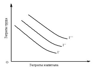 Ряд изоквант, отражающий наиболее максимально достижимый выпуск продукции при любом данном наборе факторов производства, представляет карта изоквант. Угол наклона изокванты соответствует предельной норме технической замены одного ресурса другим. Чем дальше изокванта от начала координат, тем большему объему выпуска она соответствует (Рис.2.).