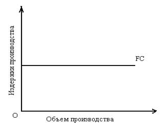 К таким издержкам относятся затраты, связанные с использованием зданий, сооружений, машин, оборудования, т.е. амортизация, а также затраты на содержание персонала, рента и процент. Эти издержки предприятие вынуждено нести независимо от степени задействования производственных мощностей, сокращения или расширения объема выпускаемой продукции. Зависимость динамики постоянных издержек в ответ на изменение объема выпуска продукции модно представить на графике следующим образом (Рис.3.).