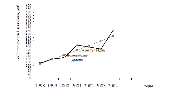 Себестоимость молока с 1998 года по 2004 год имеет тенденцию к повышению, темпы роста себестоимости 1ц показали ее увеличение в 3,18 раза в 2004 году к уровню 1998 года. Наибольший удельный вес в структуре затрат на 1 ц молока в 2004 году занимают заработная плата – 24,1 % и корма – 41,9 %. Затраты на корма увеличились на 87,3 %, затраты на содержание основных средств на 38,4%, прочие прямые затраты на 100,4 %, затраты на заработную плату на 52,7 %, накладные расходы на 40,6%.