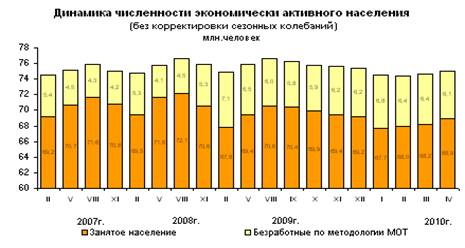 Численность экономически активного населения в возрасте 15-72 лет (занятые + безработные) в апреле 2010г. составила 75,0 млн.человек , или около 53% от общей численности населения страны.