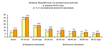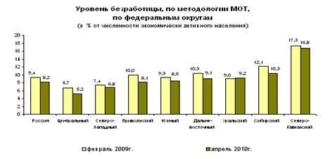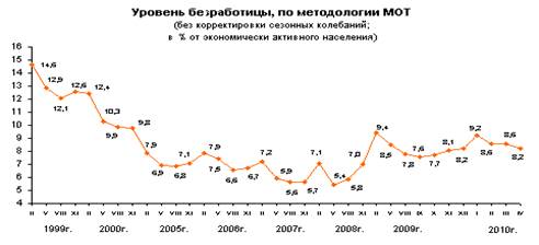 Уровень безработицы , исчисленный как отношение численности безработных к численности экономически активного населения, в апреле 2010г. составил 8,2% и был на 0,3 процентного пункта ниже, чем в мае 2009, и на 0,2 процентного пункта ниже, чем в феврале 2010 года.