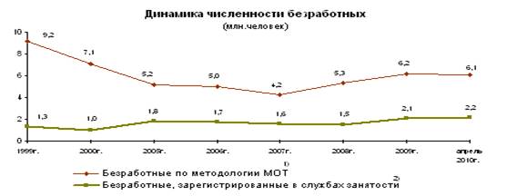 Общая численность безработных , классифицируемых в соответствии с критериями МОТ, в 2,9 раза превышает численность безработных, зарегистрированных в государственных учреждениях службы занятости населения. В конце апреля 2010г. в государственных учреждениях службы занятости населения было зарегистрировано в качестве безработных 2152 тыс.человек.