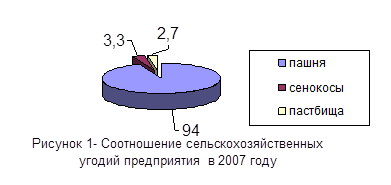 5. В структуре сельскохозяйственных угодий преобладают площади под пашней - 94%, остальные 6% распределены между сенокосами и пастбищами.